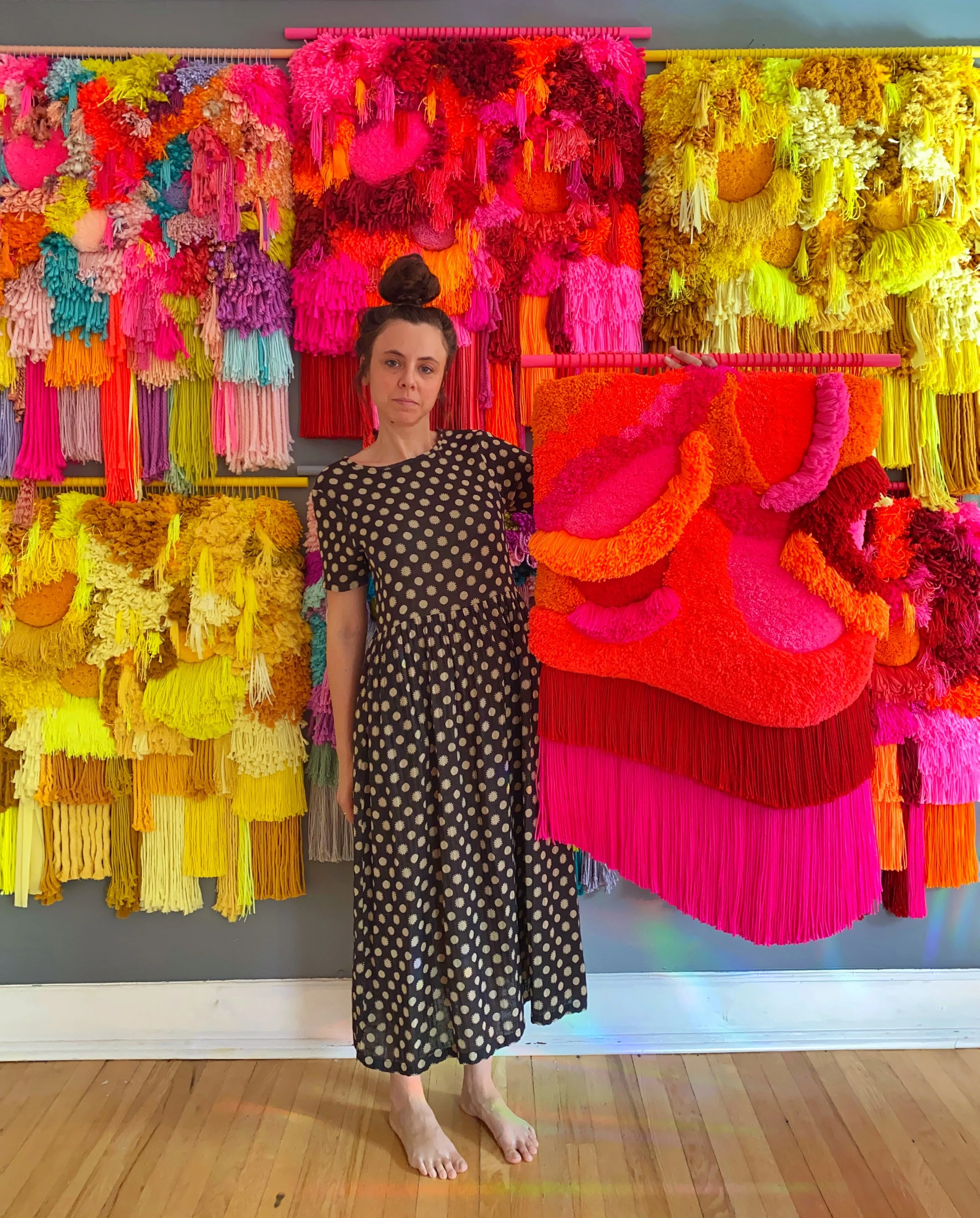 She grew up surrounded by textiles and actually learned weaving craftsmanship through her mom when she was little. She takes some old weaving techniques and gives it a twist using vibrant color combinations and a bunch of beautiful vintage threads